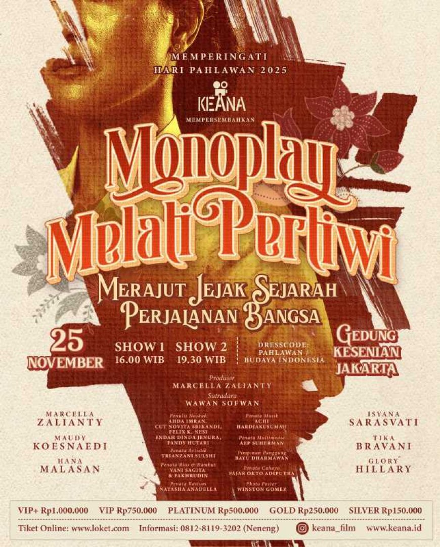 Sebagai wujud nyata persembahan Hari Kemerdekaan RI Ke-80 pada Agustus lalu, seraya memperingati bulan penghormatan terhadap para pahlawan Indonesia, Keana Production dengan bangga mempersembahkan sebuah karya seni pertunjukan monumental, 'Monoplay Melati Pertiwi: Merajut Sejarah Perjalanan Bangsa, yang mengangkat kisah heroik dan inspiratif enam Pahlawan Nasional Perempuan Indonesia dari lintas generasi, yakni: S.K. Trimurti, Nyi Ageng Serang, Ratu Kalinyamat, Rasuna Said, Christina Martha Tiahahu, dan Laksamana Malahayati.